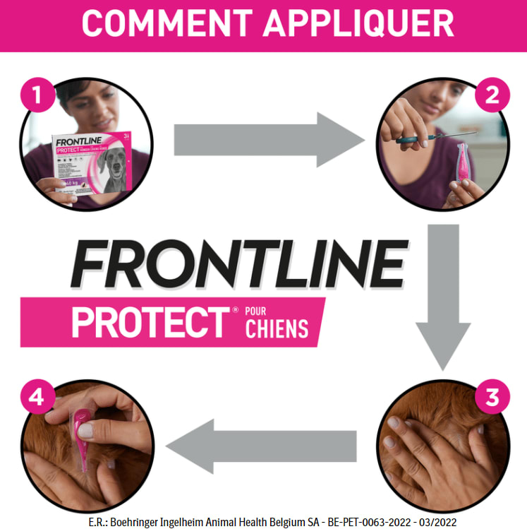 Frontline® Protect est un produit facile à appliquer qui procure à votre chien une protection contre les puces, les tiques, les phlébotomes, les mouche d’étable , les moustiques et différentes maladies à transmission vectorielle*. Frontline® Protect tue les puces et les tiques déjà présentes sur votre chien pendant 1 mois complet dans les 6 heures (après 2 jours de traitement).