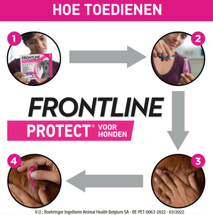 Frontline® Protect is een gemakkelijk aan te brengen vloeistof die je hond een bescherming biedt tegen vlooien, teken, zandvliegen, stalvliegen, muggen en verschillende vector overdraagbare aandoeningen*. Frontline® Protect doodt vlooien en teken op je hond gedurende een hele maand binnen 6uur (vanaf 2 dagen na de start van de behandeling).